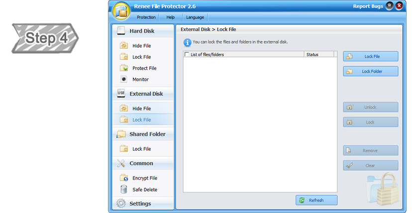Simply one-click drag and drop your files/folder/disk like music, videos, etc. from your computer into the software interface of Renee File Protector.